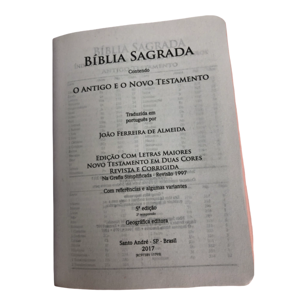 Bíblia Sagrada, com a linguagem na versão ARC (Revista Corrigida) de João Ferreira de Almeida. Sendo a versão mais utilizada pelos evangélicos do Brasil